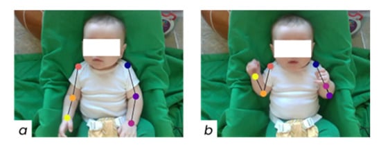 RGB images were converted into video files using ImageJ (National Institute of Health, Bethesda, MD, USA) [30] and fed to the DeepLabCut (Swiss Federal Institute of Technology, Lausanne, Switzerland) image processing tool. The tracking software was trained to identify six PoIs on the infant’s upper body: left and right shoulders (LS and RS), elbows (LE and RE), and wrists (LW and RW). All PoIs were manually labeled on 10% of the video frames (identified by DeepLabCut using a k-means algorithm that selected frames based on pixel characteristic variability) to create a training set.