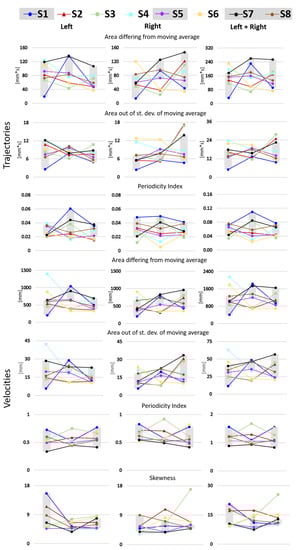 The two expert physicians involved in the study evaluated the RGB videos of the infants at 3, 4, and 5 months from birth to identify any features raising concern that an infant might not be typically developing (TD). Not all videos were commented on, but an overall evaluation of each infant was provided. The two physicians agreed that four infants (S1, S5, S7, and S8) appeared to be TD, and that one infant (S2) did show signs of possible atypical development. The physicians did not agree on the evaluation of the remaining three infants (S3, S4, and S6). Table 1 provides a complete description of the evaluations. The values of the nine GM metrics estimated from the upper body 3D PoI kinematics obtained by applying the proposed markerless method are reported in Figure 4 for each infant at each timepoint for left and right sides, both separately and together. To link the clinical evaluation to the metrics extracted, the range defined by the values found for those infants not suggesting atypical development was grayed in each plot.