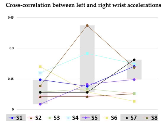 Figure 5 and Figure 6 show the cross-correlation between left and right wrists accelerations and the range of motion of the elbow angle for each subject at each timepoint (3, 4, and 5 months), respectively.