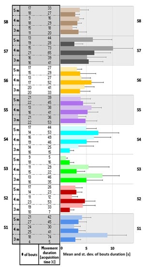 Figure 7 shows the mean and standard deviation of the bout durations for each subject at each timepoint (3, 4, and 5 months) together with the number of bouts and movement duration, calculated as percentage of the acquisition time. Infants not suggesting atypical development (grayed) appeared to move their arms more than the other infants especially at the 4 and 5 month time points.