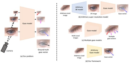 To address this problem, super-resolution (SR) methods with an arbitrary scale factor [19,20,21] can be utilized. The basic idea is to reconstruct a high-resolution image from a low-resolution image and feed the resulting image into the gaze estimation model, as shown in Figure 1b. However, the SR method requires much memory and time for training, and noise or artifacts in the reconstructed image can disturb correct gaze estimation. Figure 1c shows another approach in which different gaze estimation models are trained according to each resolution to cover input images of various resolutions. However, this method requires a large number of models corresponding to multiple resolutions.
