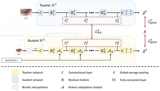 The student network outputs a gaze vector from an arbitrary-sized low-resolution image and its scale factor s. As shown in Figure 2, has a structure in which a bicubic interpolation module and N feature adaptation modules (, …, ) are added to , where each feature adaptation module is placed after each residual module. First, the bicubic interpolation is applied to an arbitrary-sized low-resolution image to output an image having the same resolution as . Then, is fed into the convolutional layer and passed through the residual module and feature adaptation module alternately. computed by the last feature adaptation module is fed into the global average pooling layer, and the gaze vector estimation is generated through two FC layers.
