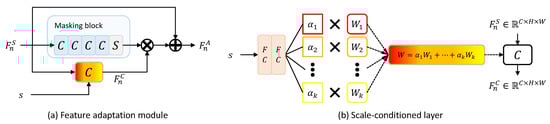 The values of {kernel size, stride, padding} of the four convolutional layers in the feature adaptation module are {3, 1, 1}. Except in the last layer, the convolutional layer is followed by batch normalization and ReLU activation functions. The activation function following the last convolutional layer is a sigmoid function, as shown in Figure 3a. The number of output channels depends on the number of input channels. Assuming that the number of input channels is C, the number of output channels is reduced to , , , 1. The size of the FC layers in the scale-conditioned layer is 64 and 4, and the size of the expert is .