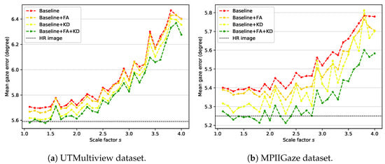 According to the experimental results, Baseline + FA achieves slightly improved results compared to Baseline, which shows that the capacity increase in the model due to the addition of the feature adaptation module helps the model adapt to input images of various sizes. However, this result corresponds to lower performance compared with Baseline + KD. Such an outcome reveals that the teacher’s information transferred through knowledge distillation is more effective for gaze estimation than the increase in the model’s capacity. Finally, Baseline + FA + KD, which is the proposed method, shows the best performance for all scale factors by using information extracted from high-resolution images and increasing the model’s capacity. This result justifies that the proposed components (FA and KD) improve the performance of our method.