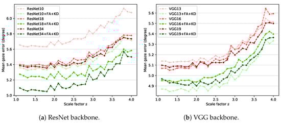 Figure 6 shows the experimental results for the two backbones. The results indicate that the proposed method improves the gaze estimation performance for arbitrary-sized low-resolution images regardless of the structure or complexity of the model. In the case of the ResNet backbone, increasing the model complexity improves the gaze estimation performance of the baseline and the proposed method. In the case of the VGG backbone, increasing model complexity does not result in performance improvement. VGG has relatively many parameters compared with ResNet, which causes overfitting. As a result, the simplest VGG-13-based model (VGG13 + FA + KD) shows the best performance for most scales.