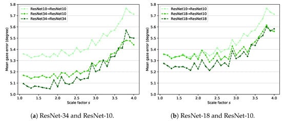 Figure 7 shows the experimental results of model compression using ResNet. ResNet-34 and ResNet-18 are used for the teacher network in Figure 7a,b, respectively. In both cases, the student network is based on ResNet-10. According to Figure 7a, ResNet34→ResNet34 outperforms ResNet10→ResNet10. This finding reveals that using a complex backbone improves gaze estimation performance. Using a lighter student network (ResNet34→ResNet10) slightly reduces the performance compared with ResNet34→ResNet34, but it still achieves better performance than ResNet10→ResNet10. Figure 7b also shows similar experimental results. Model compression is evidently effective in the proposed method.