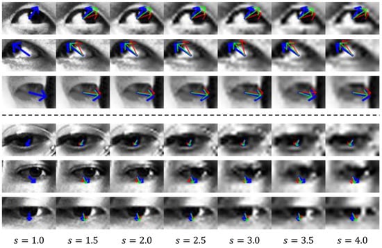 Figure 8 shows the visualization of the gaze vector estimated through the proposed method. The top three and bottom three rows show the results for the UTMV and MPII datasets, respectively. Each column shows the results for a scale factor sampled at intervals of 0.5 from 1.0 to 4.0. A scale factor of 1.0 means that a high-resolution () image is used. The blue arrow indicates the ground-truth gaze vector projected on the image. The green and red arrows correspond to the results estimated through the proposed method and baseline, respectively. As shown in Figure 8, the gaze vector inferred by the proposed method points in a direction more similar to the ground-truth vector than the gaze vector from the baseline. Hence, the proposed method can perform a more accurate gaze estimation than the baseline from input images of various resolutions.