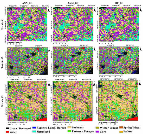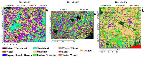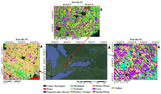 Test sites 1 (45.1° N, 75.2° W), 2 (43.6° N, 80.4° W), and 3 (42.1° N, 82.8° W) are located in different geographical conditions. The area of these test sites is about 632.7, 682.2, and 915.0 km2, respectively. The area under cultivation of dominant agricultural products in these test sites—including corn, soybean, and wheat—is 231.2, 178.0, and 9.4 km2 for test site 1; 233.3, 157.7, and 100.9 km2 for test site 2; and 62.3, 570.8 and 47.7 km2 for test site 3, respectively. Fallow, urban/developed, pasture/forages, exposed land/barren, shrubland, and water are other land covers in these three test sites.