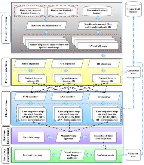 After pre-processing satellite images, the characteristics utilized in the process of classification were extracted based on spectral bands. Then, the optimal features for classification algorithms were determined using training data and various feature selection algorithms including Boruta, recursive feature elimination (RFE) and random forest (RF). After that, various classifiers, including artificial neural network (ANN), support vector machine (SVM), and RF, were implemented for preparing land crop maps according to optimal features and training data. In the following step, to improve the accuracy of the results, maps of land crops derived from several scenarios were integrated. A new land crop map and classification uncertainty map were prepared using a fusion-based voting strategy at the decision level. Finally, different scenarios for land crop mapping were assessed and compared based on accuracy evaluation metrics (Figure 2).