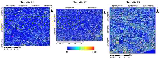 Uncertainty of land crop/cover map obtained from voting strategy for test sites 1, 2, and 3. It is ranged between 0 and 100. The blue color is related to 0 and red color is related to 100.