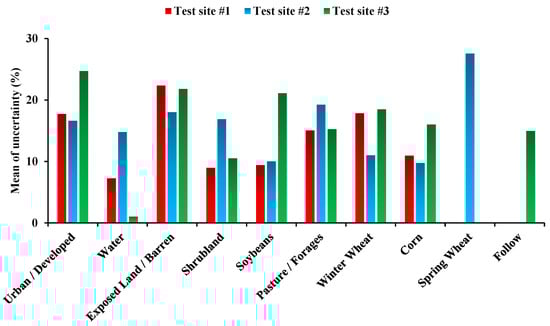Mean uncertainty of each land crop/cover classes classification for test site 1, 2, and 3.