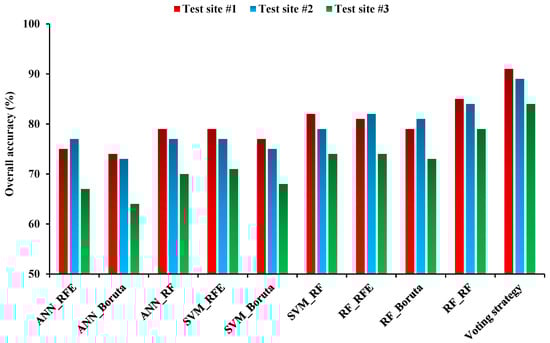 The overall accuracy calculated, based on the reference data for maps of the land crops derived from several scenarios, varied (Figure 7). The overall accuracy of ANN_Boruta scenario was lower than other scenarios (74, 73, and 64% for test sites 1, 2, and 3, respectively), which indicated the poor performance of this scenario compared to the others. The highest performance of single scenarios was related to RF_RF (85, 84, and 79% for test sites 1, 2, and 3, respectively), which showed that this scenario performed better. Among the feature selection algorithms, RF accuracy was higher than RFE and Boruta. Additionally, the RF classifier proved more effective than SVM and ANN at creating maps of land crops. Test site 1 had a higher accuracy of land crop developed based on various scenarios than test Sites 2 and 3. The overall accuracy of the voting scenario (91%, 89%, and 84% for test sites 1, 2, and 3, respectively) was higher than all single scenarios, which showed that this strategy has the best accuracy and least error for classifying land crops (Figure 7).