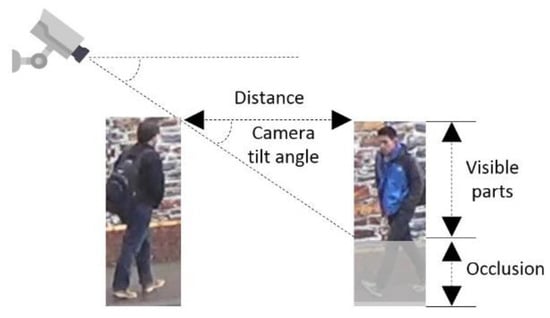 where is the camera tilt angle; D is the average distance; H is the height of the person. Since the height of each pedestrian and camera tilt angle cannot be obtained, in our experiments, we assumed an average pedestrian height of 1.70 m and an approximate tilt angle of 45 degrees. The final calculated value of the image cropping percentage can be seen in Table 1.
