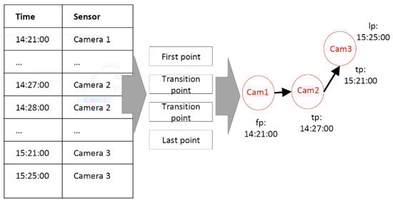 After extracting the location and time information of each pedestrian’s observed point, all of the locations are connected chronologically to generate the pedestrian’s trajectory data. In order to perform the following O–D analysis more efficiently, the points were classified as three types including the first point, transition point, and last point, as shown in Figure 4. The point where the pedestrian was identified first was regarded as the first point. The point where the pedestrian was identified last was regarded as the last point. Other points where the pedestrian appeared were treated as transition points.