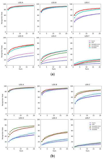 When evaluating which features are more robust, we found that when the congestion level is low and pedestrians are unobscured (maximum 10% obscured), for example, at LOS A and B, all models showed similar performance and the five curves were close, as shown in Figure 5. However, when the congestion level became higher and the pedestrians were partially occluded (10–30% area occluded), for example, LOS C and D, the performance between the different models began to differ. Overall, the models based on global features such as ResNet50, ResNet-fc512, ResNet50-mid showed better performance than the local feature- and attribute-based models at high LOS (from LOS C to F). This is despite the fact that the local feature-based model HA-CNN and attribute-based model MLFN are specifically designed models for pedestrian re-ID. Therefore, improving the performance of these models in congested scenarios should be one possible direction for future improvements.