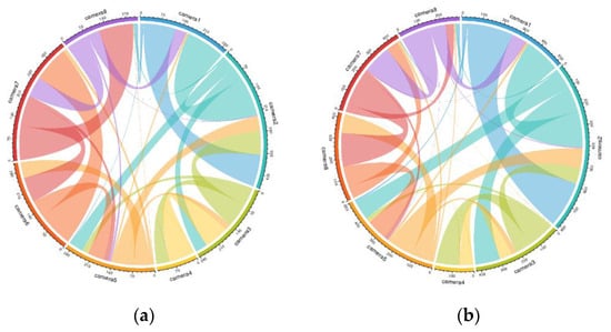 Dynamic O–D flows over different time periods can be visualised using migration flow graphs, as shown in Figure 6. The pedestrians’ origins and destinations are represented by the different coloured segments of circles. The estimated size of the flow is indicated by the width of the link line and can be read by the tick marks on the outside of the circular segments. The direction of the pedestrian flow is determined by the colour of the link and the coding of the colour at the other end. We can see that the flow from camera 1 to camera 2 increased in the second half hour, as indicated by the larger width of the blue arc. From the flow scale around the circle, we can also observe that the total flow within the coverage of camera 2 was the largest, as indicated by the longest arc length. Furthermore, since the red arc length became shorter, the total pedestrian flow in the coverage area of camera 7 reduced in the second half hour, as indicated by the shorter length of the red arc.