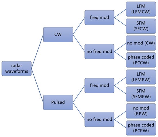 The algorithm proposed in this work identifies specific radar signals (Figure 1): Linear Frequency Modulated Pulsed Waveform (LFMPW), Stepped Frequency Modulated Pulsed Waveform (SFMCW), Phase coded pulsed waveform (PCPW), Rectangular pulsed waveform (RPW), Frequency Modulated Continuous Wave (FMCW), CW (Continuous Wave), SFCW (Stepped Frequency Continuous Wave) and Phase Coded Continuous Waveform (PCCW).
