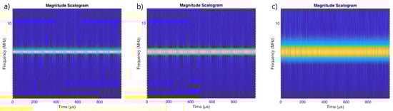 Scalogram for the PCCW signal made using wavelets: (a) Morse , . (b) Bump (c) Morse (default parameters) , .