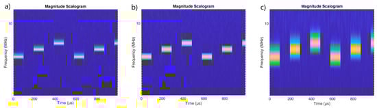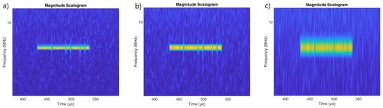 Scalogram for the SFM pulsed signal made using wavelets: (a) Morse , . (b) Bump (c) Morse (default parameters) , .