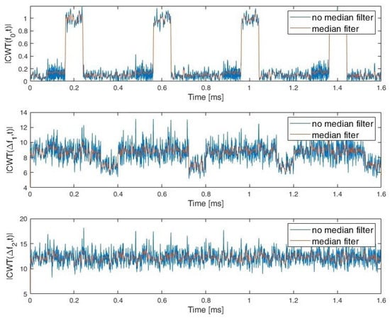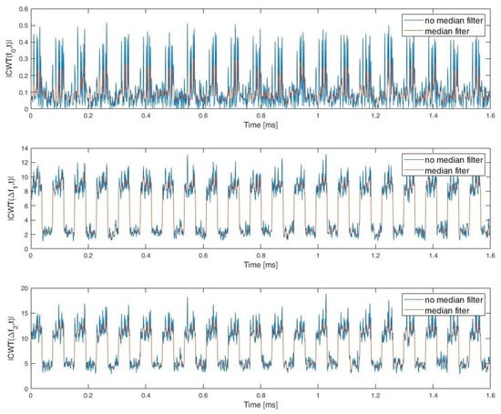 In order to reflect the characteristics of the individual types of waveforms and to enable their identification after calculating the CWT coefficients, frequency cuts for selected scales can be used, as shown in [17]. Using a median filter for smoothing purposes gives relevant features for classification [23]. The frequency cuts for frequency close to signal carrier frequency are presented in Figure 6.