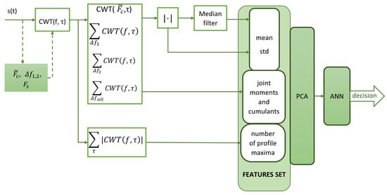 The number of determined features is 48 statistical parameters and one additional feature related to the number of profile maxima, for a total of 49. The use of the CWT frequency profile and the calculation of the number of maxima is due to the need for additional features to isolate SFM signals from LFM signals. The suitability of the CWT frequency profile is closely linked to the CWT frequency resolution and therefore to the choice of wavelet type and its parameters. If other types of wavelets are to be used, it is necessary to analyse whether the wavelet provides sufficient frequency resolution first.