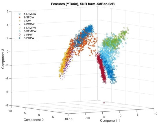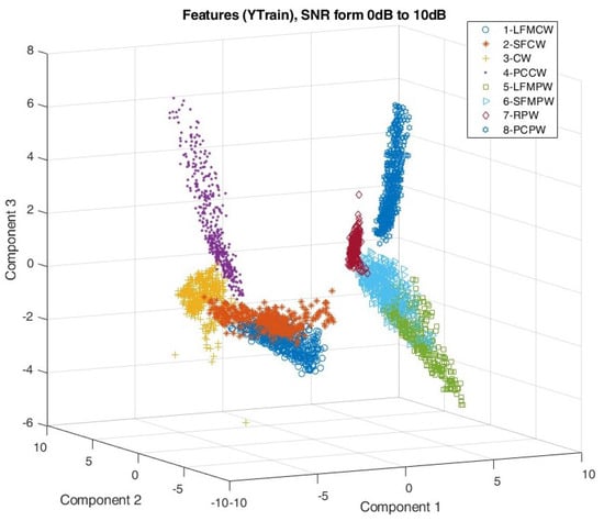Simulation studies included verification of the signal feature extraction process by observing the mutual distribution of the first three PCA components of each waveform type. The distribution of the PCA components is shown in Figure 14 and Figure 15 for SNR taking values from 0 to 10 dB and from −5 to 0 dB, respectively.