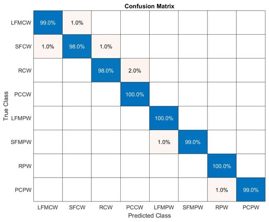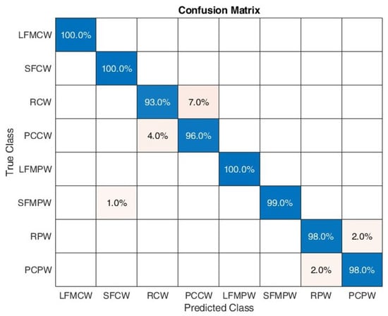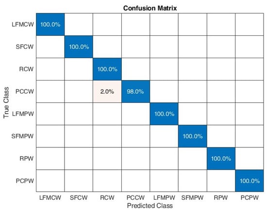Figure 16 shows the confusion matrix for the proposed algorithm when considering SNR between 0 and 10 dB. A 100% classification correctness was obtained for all signals except PCCW, where 2% was classified as RCW. Test classification accuracy was equal to 0.9975.
