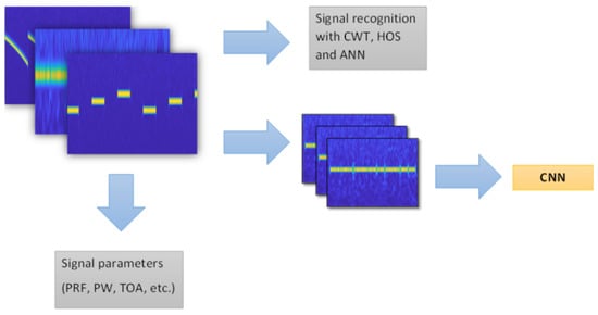 The undeniable advantage of the proposed algorithm is the ability to use once calculated CWT coefficients for the needs of other algorithms (Figure 19), e.g., to determine the parameters of signals such as PRF, PW, TOA [4], as well as by algorithms using CNN [7,13,14,15], where the CWT coefficients can act as TFI to recognise intra-pulse modulation. The performance of the signal recognition algorithm using CWT, HOS and ANN with the signals used in communication (such as ASK, PSK, FSK and QAM) was confirmed in [17]. Therefore, once computed, the CWT coefficient matrix can be used in parallel by other processing methods, which can significantly affect the functionality of the entire recognition system.