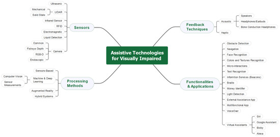 This section reviews the literature relating to this paper. Section 2.1 presents the sensor technologies and the types of sensor technologies used in the assistive tools for the visually impaired. Section 2.2 reviews the processing methods. Section 2.3 discusses the feedback techniques. A taxonomy of functions and applications is provided in Section 2.4. Section 2.5 identifies the research gap and justifies the need for this research. A taxonomy of the research on the visually impaired presented in this section is given in Figure 1. An extensive complimentary review of the assistive technologies for the visually impaired and blind can be found in our earlier work [39].