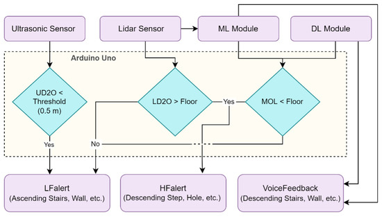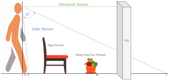 Hong et al. [79] proposed a solution for blind people based on two haptic wristbands used to provide feedback on objects. Using a LiDAR, Chun et al. [80] proposed a detection technique that reads the distances of deferent angles and then measures the predicted obstacles by comparing these reading.