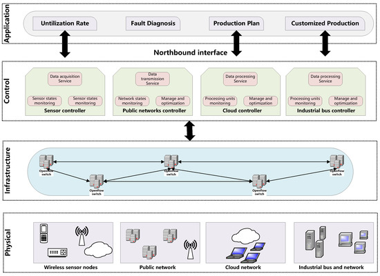 The advancement of communication technology has altered the face of human civilization as it enters the digital information era. The advancement of information technology will have an impact on the ease of living in human civilization. With the arrival of the 5G era, human society’s level of informatization will become even higher. In comparison to 4G, the 5G network’s application scenarios will span the sectors of mobile Internet, Internet of Vehicles, and the Industrial Internet. Simultaneously, operators have set greater standards for 5G networks, including huge transmission capacity, ultra-long transmission distance, network slicing, and intelligent management and control. Among them, the software-defined network (SDN) is a new type of network design idea that intends to increase network flexibility and agility and can better fulfill the network slicing demands of 5G networks. The central concept of software-defined networking is to decouple past network architecture into the control plane and the data plane and to previous abstract network functions into applications in the network operating system in the control plane [1]. From top to bottom, the software-defined network architecture is split into the application plane, control plane, infrastructure layer, and physical device layer [2,3], as illustrated in Figure 1. The system components of the application plane include application applications and network management systems. This applies to control plane service requests made via the northbound interface provided by the SDN regulator [4]. One or more SDN controllers comprise the control plane. In the software-defined network architecture, the SDN controller serves as a bridge between the application plane and the infrastructure layer. On the one hand, the SDN controller exposes diverse programmable services to upper-layer application software via the northbound interface, and network users can flexibly formulate network policies based on actual application scenarios; on the other hand, the SDN controller constructs and maintains a global network view via the southbound interface to control and manage network devices at the infrastructure layer, and inherits the control plane functions. The infrastructure layer is made up of data-forwarding devices such as switches and routers that were abstracted into network devices. The data flow is handled in accordance with the instructions given by the SDN controller, thereby improving network device management efficiency. The physical layer includes control equipment, including field instruments, sensors, and actuators and performs duties such as information interchange between the ICS controller and field equipment. SDN has gotten much attention from people from many areas of life.