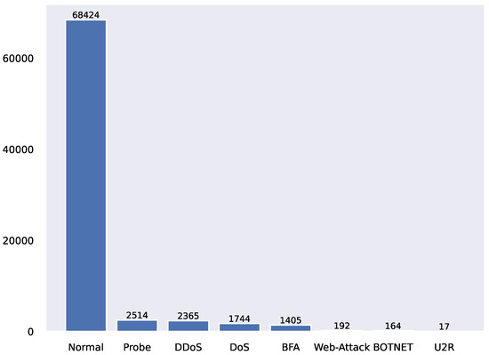 This paper evaluates the performance of TSMASAM through two experiments. This paper applies the network traffic simulation dataset [31] under the SDN architecture. It is derived from the SDN virtual environment and is constructed by multiple virtual machines using the SDN network architecture. Since the abnormal flow in [31] is much more than normal, the research team randomly selects the flow data to simulate the sample imbalance phenomenon in the real environment. The processed dataset contains 76,825 network traffic, of which 8401 are abnormal, accounting for approximately 10.94% of the overall sample. The research team used the hierarchical set-out method to divide the dataset into the training set and test set, each of which contains a total of 84 traffic eigenvalues. This dataset includes seven network attack types (Probe, DDoS, DoS, BFA, Web-Attack, BOTNET, and U2R). The distribution of each network attack is shown in Figure 4. In this experiment, seven network attack types (Probe, DDoS, DoS, BFA, Web-Attack, BOTNET, and U2R) are regarded as abnormal, and the rest are regarded as normal traffic data.