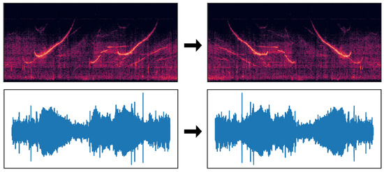 For the classification task in deep learning, one basic requirement is that the number of samples in different categories is similar since the data imbalance will affect the generalization ability of the classifier with fewer samples [59]. However, there were too few samples of the three species in the original dataset, so data augmentation was used to keep their sample sizes roughly the same. Traditional data augmentation methods include flipping, rotating, scaling, cropping, and color-jittering. Previous studies have proved that these methods can improve the classification accuracy [60]. For sound data, the samples obtained after flipping the waveform were opposite to the original samples on the time axis in the T–F domain, and belonged to different samples from the perspective of the classification model. Such data augmentation method is often used in sound classification scenes [61]. In this paper, the raw waveform was horizontally flipped for data augmentation and Figure 6 is an example of sample-flipping. The total number of samples after augmentation increased from 5514 to 7359, and the number of samples of all species was basically at the same level.
