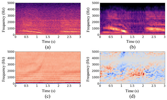 To summarize, the difference between these features can be intuitively observed through visualization. An audio sample was randomly selected from the data set in Table 1, and a high-resolution spectrogram was obtained through STFT to compare. After feature extraction processing through the above steps, four real number matrices could be obtained. The visualization results are shown in Figure 7, where the X-axis represents time with second unit and Y-axis represents frequency with Hz unit. It can be seen that although the resolution of Figure 7b is much lower than Figure 7a, the signal contour can still be seen. Furthermore, signals cannot be directly distinguished from Figure 7c,d after DCT transformation. In conclusion, it is promising to combine these four features to improve audio recognition accuracy.