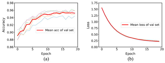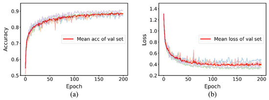After the data set was segmented using the above data segmentation method, the performance of baseline and MDF-PNet on train set and validation set was tested. In order to maintain strict consistency in data distribution, the same random seed was used to segment the data sets. Loss curve and accuracy curve can accurately visualize this process. The former represents the output of loss function, while the latter reflects the accuracy of prediction. Considering that the generalization ability of the model on validation set is the most important index pursued by the algorithm, Figure 9 and Figure 10, respectively, represent the iterative process of baseline and MDF-PNet on the validation set. The light-colored lines in the figure represent the process of five cycles of testing, and the dark lines represent their mean values.