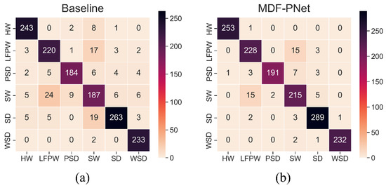 Confusion matrix of baseline and MDF-PNet on the same batch of samples. (a) Baseline and (b) MDF-PNet.