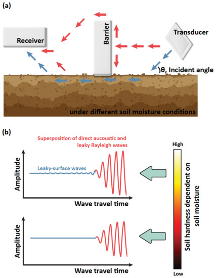 Schematic illustration of air-coupled ultrasonic method. (a) Propagation of leaky Rayleigh wave (blue) and direct acoustic (red). (b) Measurement scenario of leaky Rayleigh wave depending on soil moisture.