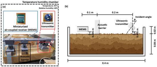 Test set-up. (a) Air-coupled ultrasonic receiver (left) and transducer (right). (b) Schematic diagram of the test set-up including the dimensions of specimens and distances between sensors, barrier, and soils.