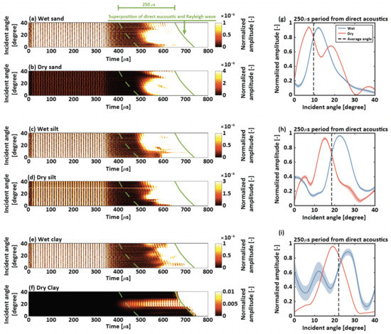 The excitations of the Rayleigh wave only require a free and viable surface, but only a joint half-space medium could generate an undistributed surface wave pulse [56]. This wave travels along the boundary between the air and the soil for the case of this study. At the critical angle, the maximum amplitude and energy of Rayleigh waves can be observed [43]. That is, the minimum wave penetration depth occurs at the critical angle by reducing the internal reflection of the acoustic waves. To determine the incident angle close to the critical angle to maximize leaky Rayleigh wave energy generations, we explored the impacts of different incident angles (ranging from 0 to 40 degrees) on the amplitude of the leaky Rayleigh waves under wet (fully saturated) and dry cases. Stacked and superposed ultrasonic signals from the eight channels under different soil types and incident angles and two levels of soil moisture are shown in Figure 4a–f. From a comparison between the wet and dry cases, the maximum amplitude under the dry soil occurred at the lower incident angle compared to that under the wet soil. An increase in soil air occupying the soil pores and the drying-induced increase in soil strength resulted in lower critical angles under the dry cases compared to the wet cases.