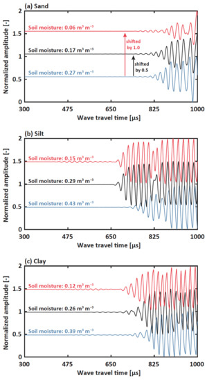 Obtained Waveforms for (a) sand (b) silt and (c) clay. Blue, black, and red colors represent nearly saturated, humid, and dry soil moisture, respectively, under different soil types. For visualization purposes, black and red lines were shifted by the normalized amplitude of 0.5 and 1.0, respectively.