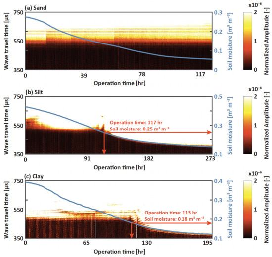 Stacked waveform images from (a) sand, (b) silt, and (c) clay. The bright colors in (a–c) represent normalized amplitudes. The x-axis represents the experimental operation time and left and right y-axes represent TOF and soil moisture, respectively.