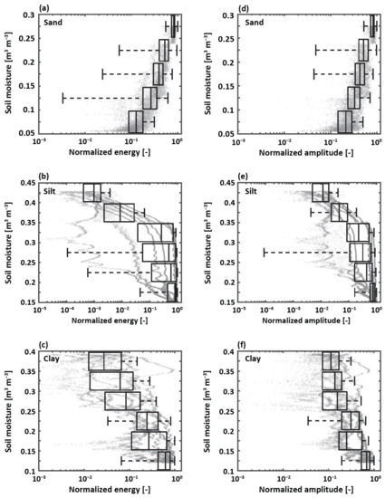 Box plots for wave properties with the soil moisture interval of 0.05 m m. The left column shows normalized energy for (a) sand, (b) silt, and (c) clay. The right column shows normalized amplitude for (d) sand, (e) silt, and (f) clay. The gray dots represent the estimated wave properties from the 8 receivers.