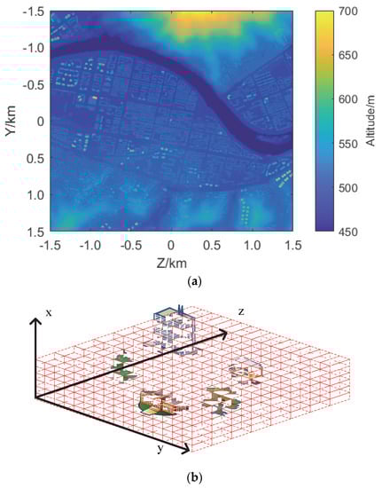 The digital elevation map in this paper is the urban elevation map formed by the superposition of the topographic height map and the building height map of a city provided by a research institute in China, as shown in Figure 4. One pixel corresponds to 1 m × 1 m area. The map covers a 3000 × 3000 m2 area, with altitudes between 450 and 700 m. We set the size of cells is 1 m × 1 m × 1 m to obtain 3000 × 3000 × 700 cells. The target is set to a 3 m × 9 m × 8 m cuboid with a scattering coefficient of 0.1, a circular flight path with a radius of 1000 m and an altitude of 600 m.