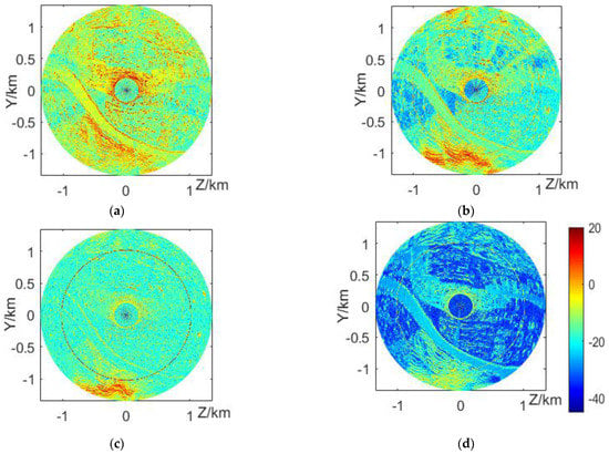 The clutter maps with at different radar altitudes in (a–d) of 500 m, 550 m, 600 m, and 650 m, respectively. These results correspond to the DEM, in which the mountainous area at the lower side of the map corresponds to the red strong clutter area at the lower part of the clutter map, the flat terrain and river area on the left form the blue weak clutter area, and there are obvious red spots in the clutter map corresponding to some high-rise buildings on the right. The “hollow” phenomenon in the central area of the clutter map is mainly due to the failure to consider the influence of the near-field effect and radar sidelobe.