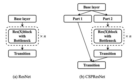 CSPDarknet53 is the backbone feature extraction network of YOLOv4, which mainly borrows the idea of CSPNet [31] on Darknet53 and improves the residual network structure module. The specific structure is shown in Figure 3. CSPResNet can be seen as the original residual part, divided into two different paths for convolution separately. Afterward, the feature information is fused. CSPResNet retains the advantage of the feature reuse of ResBlock, but prevents excessive duplicate gradient information by truncating the gradient stream.