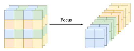 ‘Focus’ was proposed by Glenn Jocher et al. [33], which consists of a slice operation on the image before it enters the backbone network. The specific operation is to take a value for every pixel in an image, similar to neighborhood downsampling, in order to obtain four feature layers with the same width and height as the channel. Stacking these four feature layers expands the input channel by a factor of four without losing the information of the original input. The Focus structure is shown in Figure 6. After the Focus module, the channel was changed to 12, which was expanded to 64 by one convolution. Using the Focus module and one convolution, instead of two convolutions, can effectively reduce the number of parameters and computation, thus increasing the speed of forward- and backpropagation.