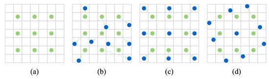 Illustration of the sampling locations in standard and dilated–deformable convolutions. (a) Regular sampling grid (green dots) for standard convolution. (b) Dilated–deformable sampling locations (dark blue dots) with enhanced offset (light blue arrows) in the dilated–deformable convolution. (c,d) Particular cases of (b), showing that the dilated–deformable convolution generalizes the various transformations of the scale, (anisotropic) aspect ratio, and rotation [34]. The dilated–deformable improves on the deformable convolution.