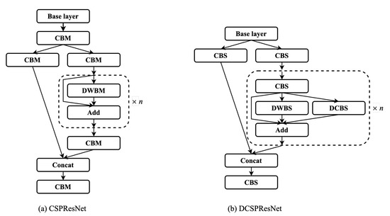 Network structure of CSPResNet and DCSPResNet. CBM consists of convolution, batch normalization, and the Mish activation function. DWBM consists of depth-wise separable convolution, batch normalization, and the Mish activation function. The CBS, DWBS, and DCBS structures are shown in Figure 9.