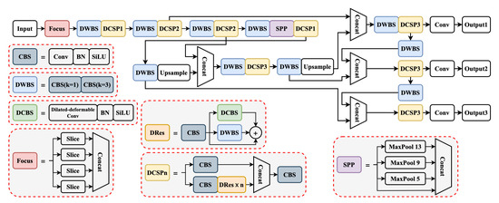 SPP consists of convolution and pooling parts, where the convolution part consists of three consecutive convolution blocks. The convolutional part was replaced by a depth-wise separable convolution block and a DCSPResNet module, placed before and after the pooling operations, respectively. FPN and PAN consist of downsampling, upsampling, and four convolutional parts, where the convolutional part consists of five consecutive convolutional blocks. Downsampling and DCSPResNet modules were used to replace the convolutional part. The YOLO head consists of a convolution block and a basic convolution. We removed the convolution block and kept only the basic convolution.