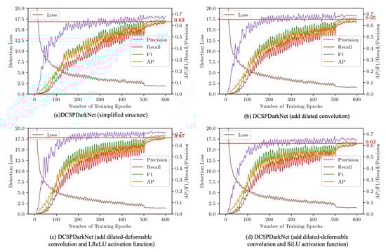 The training curve in the ablation experiment on the garbage data set: (a) the simplified model of the network; (b) the model after adding dilation convolution to (a); (c) the model after adding deformation convolution and the LReLU activation function to (a); and (d) the model after adding deformation convolution and the SiLU activation function to (a).